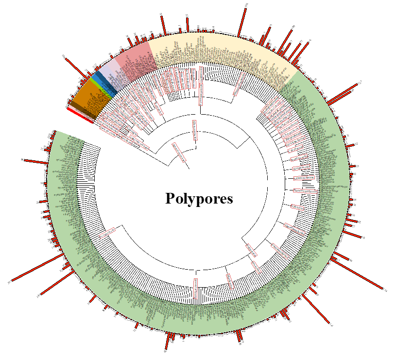 Polypores were mostly defined as wood-inhabiting basidio-mycetes with a poroid hymenophore, traditionally, polypores belonged to the Aphyllophorales (Fig. 1). So, some species with a hymenophore configuration other than poroid are also included, for instance, some species with lamellae or sublam-ellate, irpicoid, hydnoid, and corticioid hymenophore (Ryvarden 1991; Wu et al. 2022a; Zhao et al. 2024). Currently, polypores belong to 11 orders within the Agaricomycetes, namely Agaricales, Amylocorticiales, Auriculariales, Boletales, Can-tharellales, Gloeophyllales, Hymenochaetales, Polyporales, Russulales, Thelephorales, and Trechisporales (Ryvarden 1991; Zhao et al. 2015; Wu et al. 2022a; Zhao et al. 2024). In addition, a classification hierarchy of genus and family was generated with Lifemap (https://lifemap-ncbi.univ-lyon1.fr/, 20th July 2025) using the checklist of polypores (File S1), to compare with the previous studies (Zhou et al. 2023; Hyde et al. 2024b; Xu et al. 2025; Zhao et al. 2025a), a diagram was generated with iTOL (https://itol.embl.de/) with the number of species in each genus.