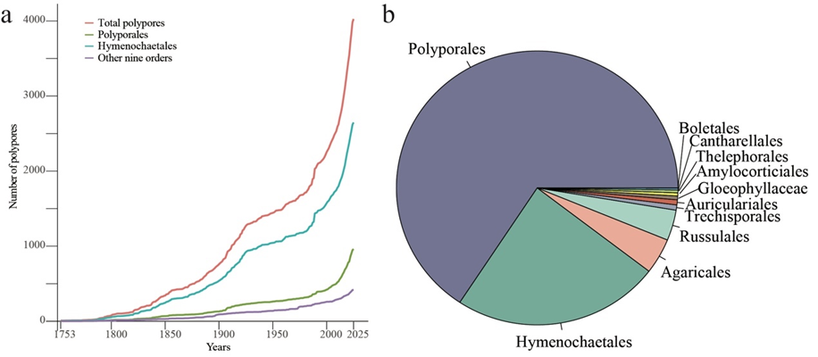 Since Linnaeus named polypore species using binomial no-menclature in 1753, the number of polypore species has steadily increased. By 1912, after 159 years, the number of polypores exceeded 1,000, reaching 1,009. By 1989, 77 years later, it surpassed 2,000, reaching 2,031. By 2016, it exceeded 3,000 in just 27 years, reaching 3,010, and more than 1,000 new species have been described from 2017 to March 2025. Currently, 4,026 species have been described worldwide until May 2025 (Fig. 2, Fig. 3a, and File S1). Meanwhile, the pol-ypore numbers in the main orders, Polyporales and Hy-menochaetales, show similar trends.