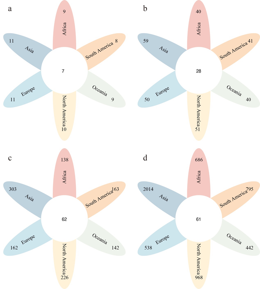 The Sørensen Similarity index (SS) among the studied continents was tested using the following equation: SS=2C/(A+B), where A and B were the species numbers in the two compared continents, and C was the number of species recorded in both continents (Sørensen 1948; Wu et al. 2022a; Zhao et al. 2024). Columnar and line charts, and Voronoi diagrams were performed using the R programs ggplot2 (Wilkinson 2011), and voronoiTreemap (https://github.com/uRosConf/voronoiTreemap, accessed on 10th February 2024), respectively, in the R package v4.1.2 (R Core Team 2013). Flower plots were tested using the imageGP 2 website (Chen et al. 2024; http://www.bic.ac.cn/BIC/).
