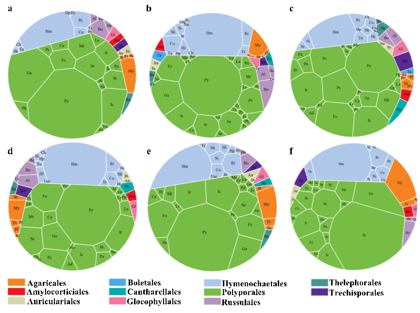 The order Polyporales dominated across six continents, with proportions ranging from 62.5% in Asia and 75.95% in Africa (Fig. 5). Next was the Hymenochaetales, comprising 15.01 % in Africa to 26.51 % in Asia. Agaricales ranked third, with a range of 1.86 % in Europe to 7.17 % in South America. Russulales followed in fourth, showing proportions from 1.61 % in Oceania to 4.5 % in Asia. Additionally, eight other orders collectively accounted for only 4.02 % in South America to 10.04 % in Europe.