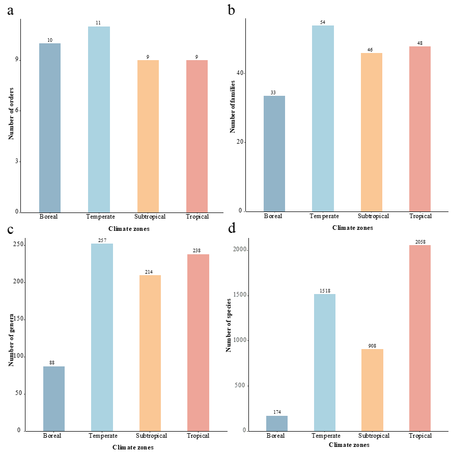 In this study, four climate zones were classified, viz., boreal, temperate, subtropical, and tropical. The distribution of pol-ypores is listed in File S1. The temperate zone has the highest richness of order, family, and genus with 11, 54, 257, respec-tively, compared to the boreal zone (10 orders, 33 families, and 88 genera), the subtropical zone (9 orders, 46 families, and 214 genera), and the tropical zone (9 orders, 48 families, and 238 genera, Fig. 6a-c). At the species level, the tropical and tem-perate zones have the greatest number, with 2,058 and 1,518 species, respectively, followed by the subtropical zone with 908 species and the boreal zone with 174 species (Fig. 6d).
