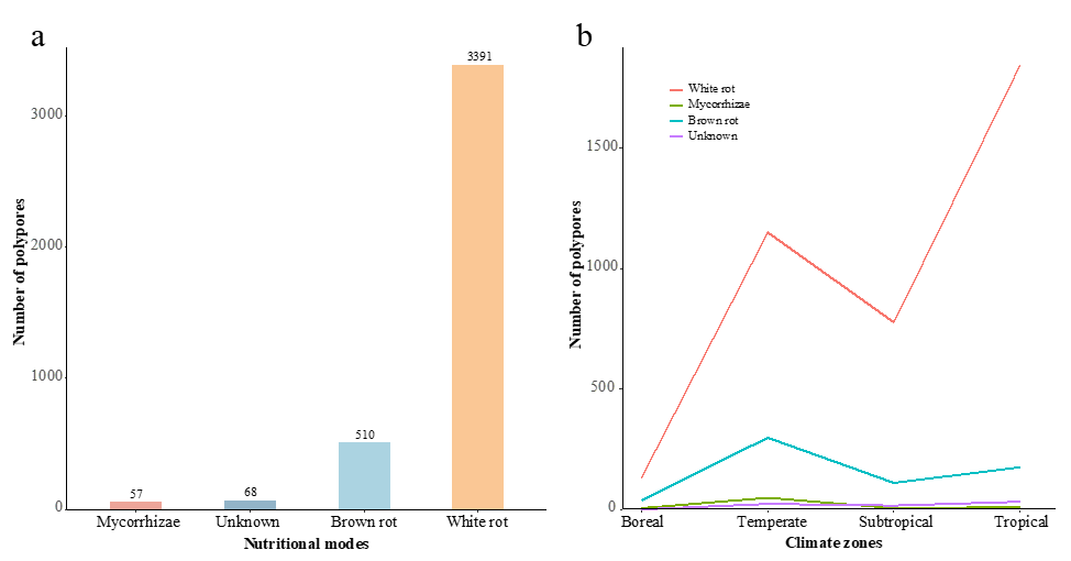 Four nutritional modes were identified, including white rot, brown rot, mycorrhizae, and unknown. Of the 4,026 species, the majority were white rot fungi, comprising 3,391 species, or 84.22 % of the total polypores (Fig. 7a). Brown rot fungi in-cluded 510 species, making up 12.67 % of the total polypores (Fig. 7a). Mycorrhizal fungi and those treated as unknown accounted for a smaller number, with 57 and 68 species, respectively, rep-resenting 1.42 % and 1.69 % of the total polypores (Fig. 7a).