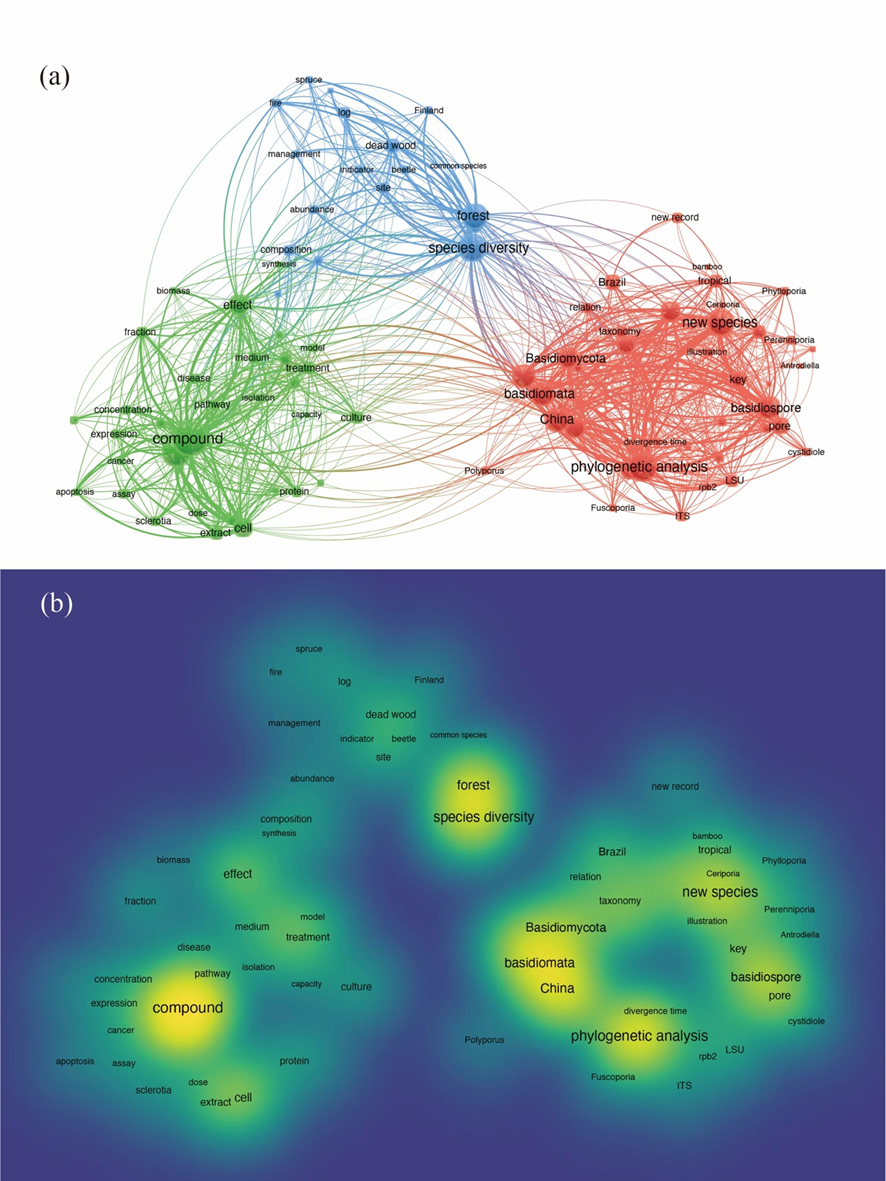 Fig 8. (a) Co-occurrence network plot and (b) research hotspot map using keywords “polypores”, “Hymenochaetaceae”, and “Polyporaceae” based on the Web of Science Core Collection Citation database. The node size represents the frequency of occurrence, and the connecting lines between nodes represent the co-occurrence relationship. Centrality represents the frequency of linkages between different clusters, whereas density represents the frequency of internal links within a cluster.Co-occurrence network analysis of the keywords revealed three distinct clusters (Fig. 8a). Cluster 1, containing 41 key-words centred around “phylogenetic analyses” and “new spe-cies”, was linked to terms such as Basidiomycota, China, genus, and morphological characters, indicating a focus on the taxonomy of polypores based on morphological and mo-lecular phylogenetic studies. Cluster 2 comprised 32 keywords, with “activity” and “compound” as the core, connected to terms like disease, effect, rat, and treatment. This cluster suggests research related to the applications of polypores. Cluster 3 included 18 keywords, with “forest” and “species diversity” at its centre, linked to factors such as amount, fire, and habitat, highlighting the ecological relationships involving polypores. Furthermore, the research hotspot map corroborated these three clusters as key trends in polypore studies (Fig. 8b).
